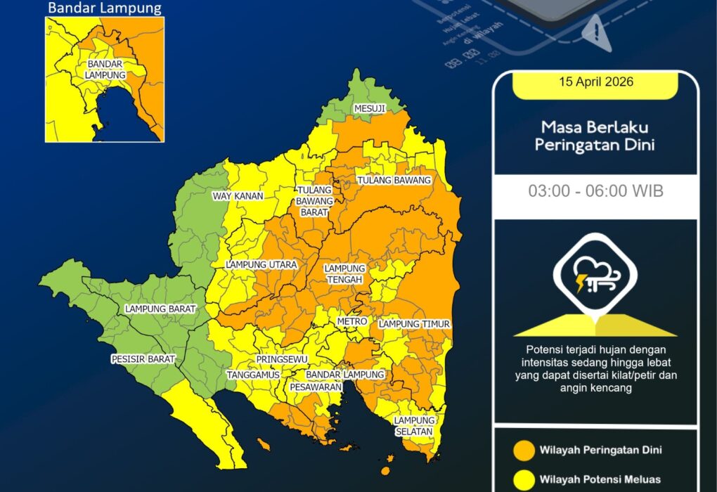 BANDAR LAMPUNG, (SA) ā Warga di sejumlah wilayah Provinsi Lampung diminta meningkatkan kewaspadaan terhadap perubahan cuaca pada Rabu, 15 April 2026. Badan Meteorologi, Klimatologi, dan Geofisika (BMKG) Lampung memperingatkan potensi hujan sedang hingga lebat yang disertai kilat, petir, dan angin kencang di beberapa daerah. Kondisi cuaca tersebut dikhawatirkan dapat memicu gangguan aktivitas masyarakat, terutama di…