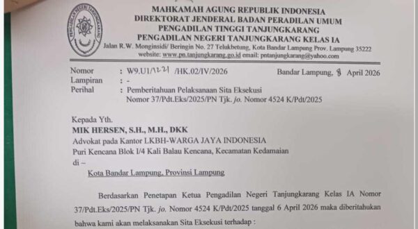BANDARLAMPUNG, (SA) – Perkembangan kasus perseteruan antara Nuryadin melawan Darussalam memasuki babak baru, setelah sebelumnya Gelar Perkara Khusus (GPK) berhasil dilaksanakan di Mabes Polri pada 12 Maret 2026. Kabar terkini yang diterima oleh media dari tim kuasa Hukum Nuryadin yakni Mik Hersen, SH, MH, Irfan Balga, SH dan Angga Wijaya, SH, MH pada Selasa (14/04/2026) bahwa tim kuasa hukum menerima Surat Pemberitahuan Pelaksanaan Sita Eksekusi bernomor W9.UI/1221/HK.02/IV/2026 tertanggal 8 April 2026 dari Pengadilan Negri Tanjung Karang kelas IA.