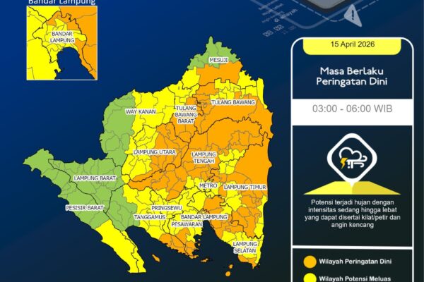 BANDAR LAMPUNG, (SA) ā Warga di sejumlah wilayah Provinsi Lampung diminta meningkatkan kewaspadaan terhadap perubahan cuaca pada Rabu, 15 April 2026. Badan Meteorologi, Klimatologi, dan Geofisika (BMKG) Lampung memperingatkan potensi hujan sedang hingga lebat yang disertai kilat, petir, dan angin kencang di beberapa daerah. Kondisi cuaca tersebut dikhawatirkan dapat memicu gangguan aktivitas masyarakat, terutama di…
